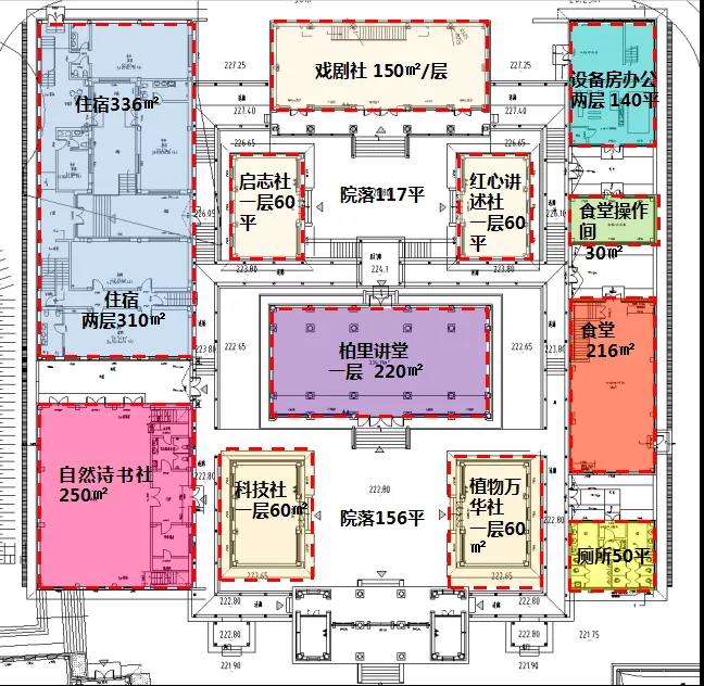 研學團隊的固定食宿場所主要集中在柏里書院,一、二層共安排了約 400 ㎡的學生集體宿舍,一層設(shè)茶餐廳,提供簡餐、咖啡、甜點等多元服務(wù),并在非餐時段可以為書院游客提供休閑閱讀的空間。二層有散席四人桌,使其在非餐時段具有多功能,可以進行小型的沙龍聚會。同時配設(shè)了淋浴室、值班室、醫(yī)療點等,保障研學團隊的生活需求。