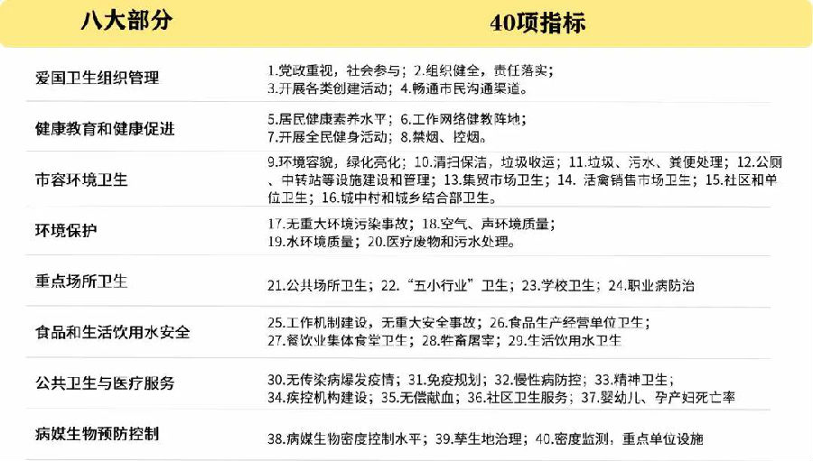 本標(biāo)準(zhǔn)適用于除直轄市以外的設(shè)市城市和直轄市所轄行政區(qū),分八大部分、40項(xiàng)指標(biāo)。