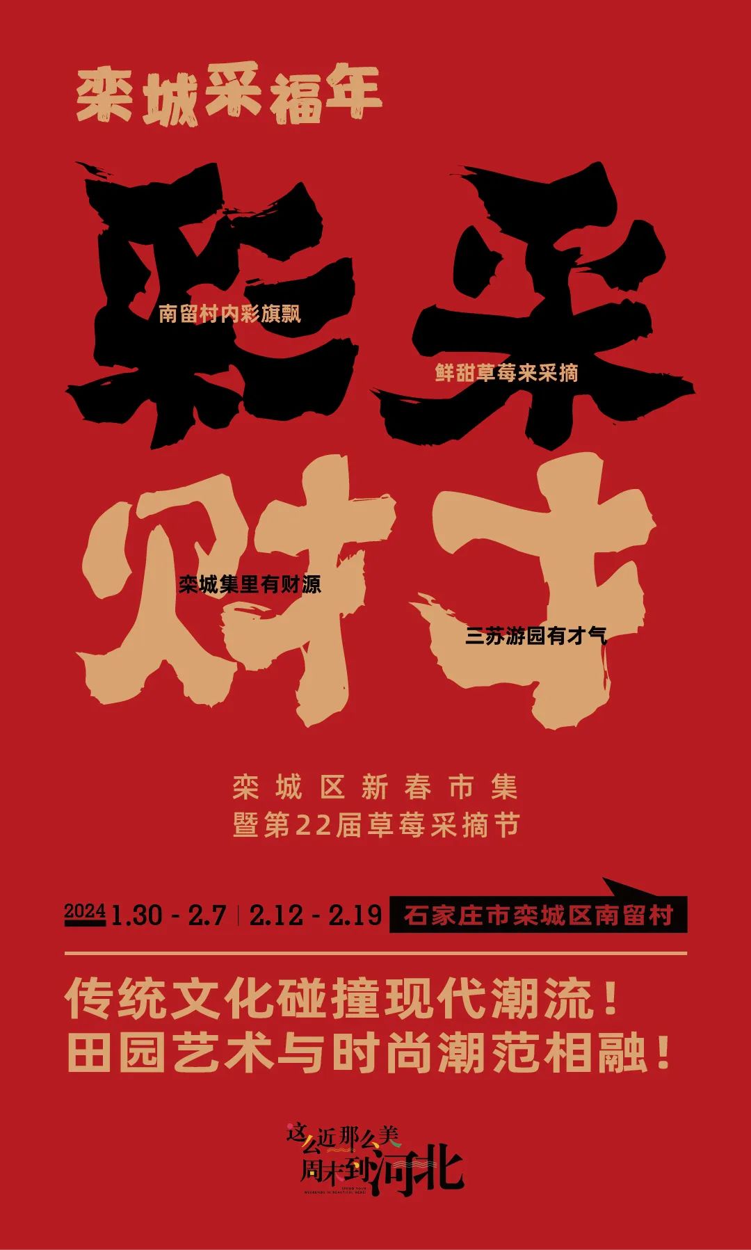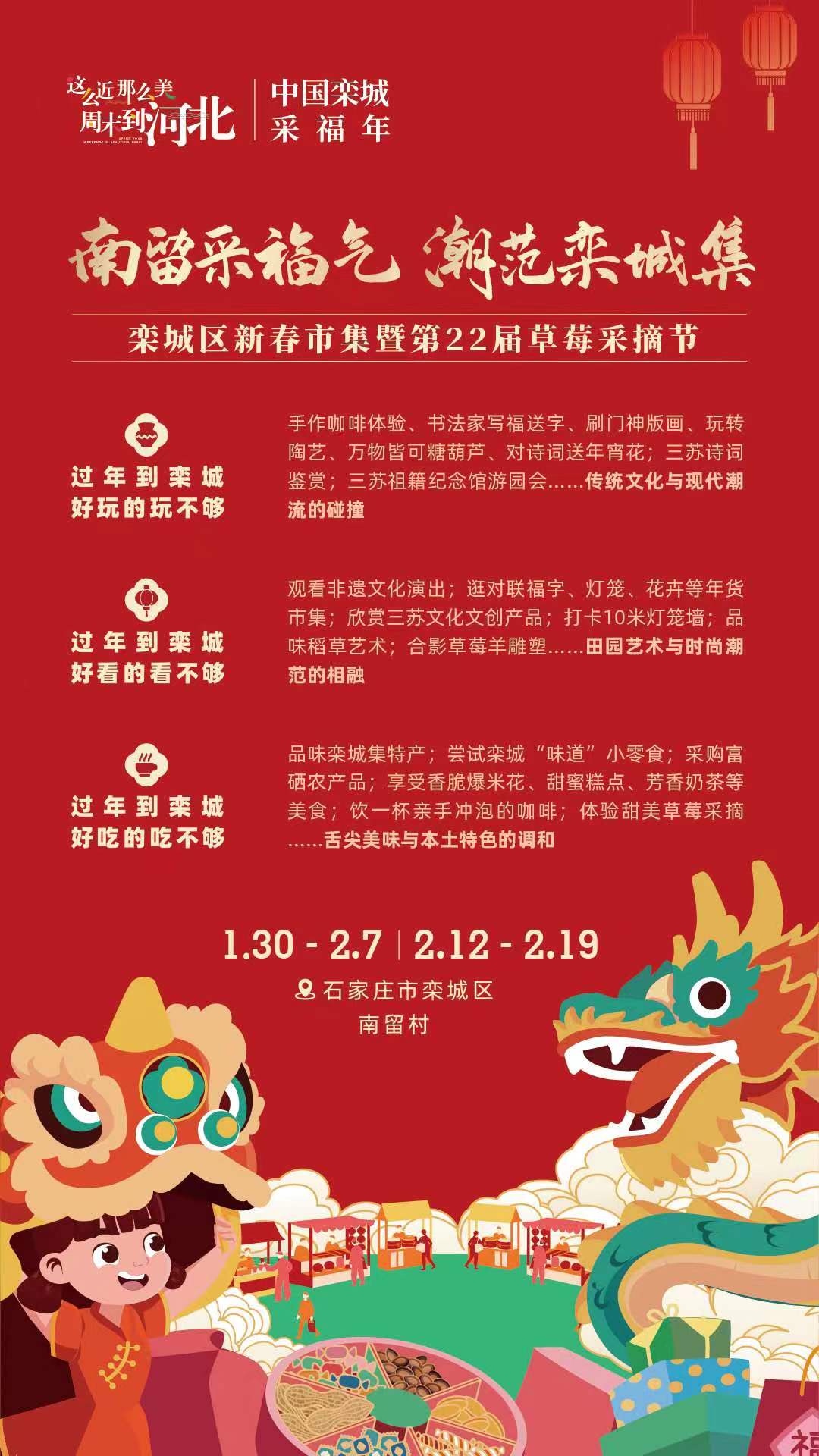 人間煙火氣,年味正濃時(shí)。新春將至,為更好滿足群眾的消費(fèi)需求,以“南留采福氣 潮范欒城集”為主題的石家莊市欒城區(qū)新春市集暨第22屆草莓采摘節(jié)將于1月30日(臘月二十)正式啟動(dòng)。