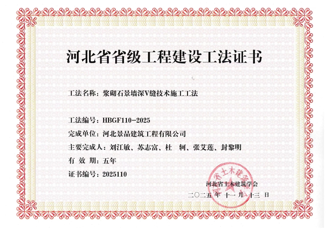 近日,經(jīng)河北省土木建筑學(xué)會評審,由我集團(tuán)自主研發(fā)并申報的《漿砌石景墻深V縫技術(shù)施工工法》成功獲評2025年度河北省省級工程建設(shè)工法。此項榮譽(yù)標(biāo)志著集團(tuán)在建筑科技領(lǐng)域的創(chuàng)新實力與技術(shù)積淀獲得權(quán)威認(rèn)可。